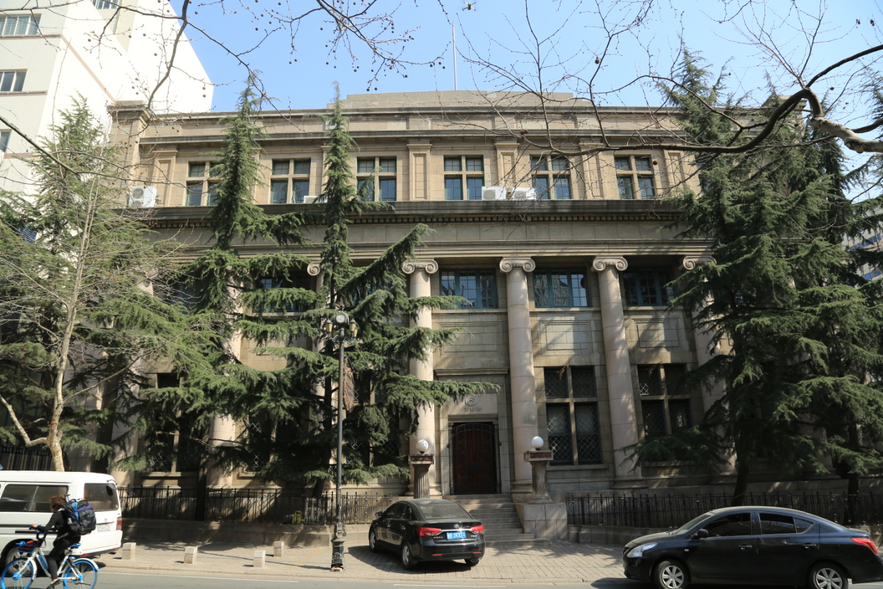 三菱洋行舊址,位于市北區(qū)館陶路3號,基地面積4825平方米,建筑面積2236平方米。建筑立面為歐洲古典樣式,磚石結(jié)構(gòu),地上三層,花崗石砌基,樓的四角由方形花崗石筑成,墻體結(jié)構(gòu)以l6根貼面石柱閭置木制落地窗組成,墻面設(shè)計有棋狀圖案。正門西向,8根仿羅馬圓形石柱,自基座直達二層頂部,高約11米,撐起三層屋檐,屋檐為線飾壓條石。登9級臺階達引廓再至入口處,一層大廳高6米,面積約400平方米,水磨石地面,鋼筋混凝土天花板,有凹面雕花藻井。