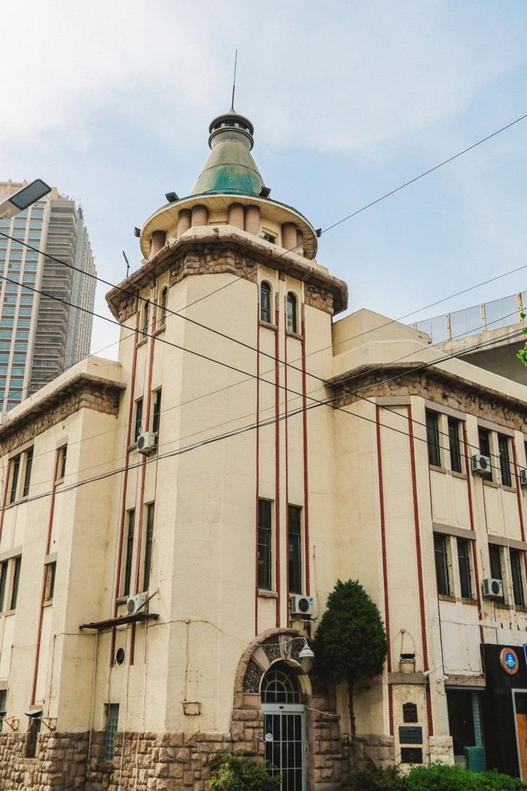 膠澳商埠電汽事務(wù)所舊址,位于市南區(qū)中山路216號(hào)。占地面積305.33平方米,建筑面積2190.9平方米。磚木結(jié)構(gòu),坐西朝東?;◢弾r大蘑菇石砌基,黃色拉毛墻面,紅色坡屋頂,平面呈L型,分為南、北兩部分。南部為4層古堡式塔樓;北部為20年代增建的3層德國(guó)三段式辦公樓,北部平頂,南部上有綠銅皮復(fù)頂?shù)募馑?。正門(mén)東向,建筑格調(diào)古樸典雅,莊重大方。