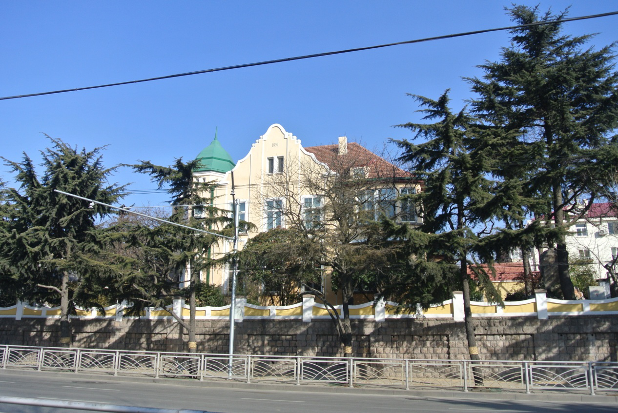德國(guó)領(lǐng)事館舊址,位于市南區(qū)青島路1號(hào),建筑面積約1165.4平方米,占地1408平方米。最初為德國(guó)奧爾格亞卜店斯基的私人寓所,后曾為德國(guó)領(lǐng)事館駐地。1947年孔士勸、孔令明等買(mǎi)下共有,1986年時(shí)任山東省政協(xié)副主席的孔令仁將該房捐贈(zèng)給青島市人民政府,后辟為青島南園孔子紀(jì)念館。該建筑屬“三段式”別墅式建筑,磚木石結(jié)構(gòu),二層帶有閣樓和地下室。南面入口用粗獷的蘑菇石砌半圓券。大樓中部拐角取以圓形,上部八邊形尖頂塔樓,相鄰兩側(cè)山花式山墻成不對(duì)稱(chēng)式。