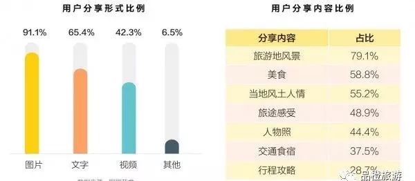 報(bào)告指出,分享已經(jīng)成為當(dāng)代旅行者的行為偏好。同程藝龍的調(diào)研數(shù)據(jù)顯示,60.8%的用戶在過去一年中有過旅游經(jīng)歷的分享行為,分享載體以圖片為主(91.1%),配合文字內(nèi)容。同時(shí),短視頻的分享熱度也不斷攀升,42.3%的用戶使用過這一分享載體;馬蜂窩旅游網(wǎng)的調(diào)研數(shù)據(jù)顯示,用戶分享的內(nèi)容以風(fēng)景和美食為主,當(dāng)?shù)仫L(fēng)土人情、旅行感受、人物照片分列三、四、五位。